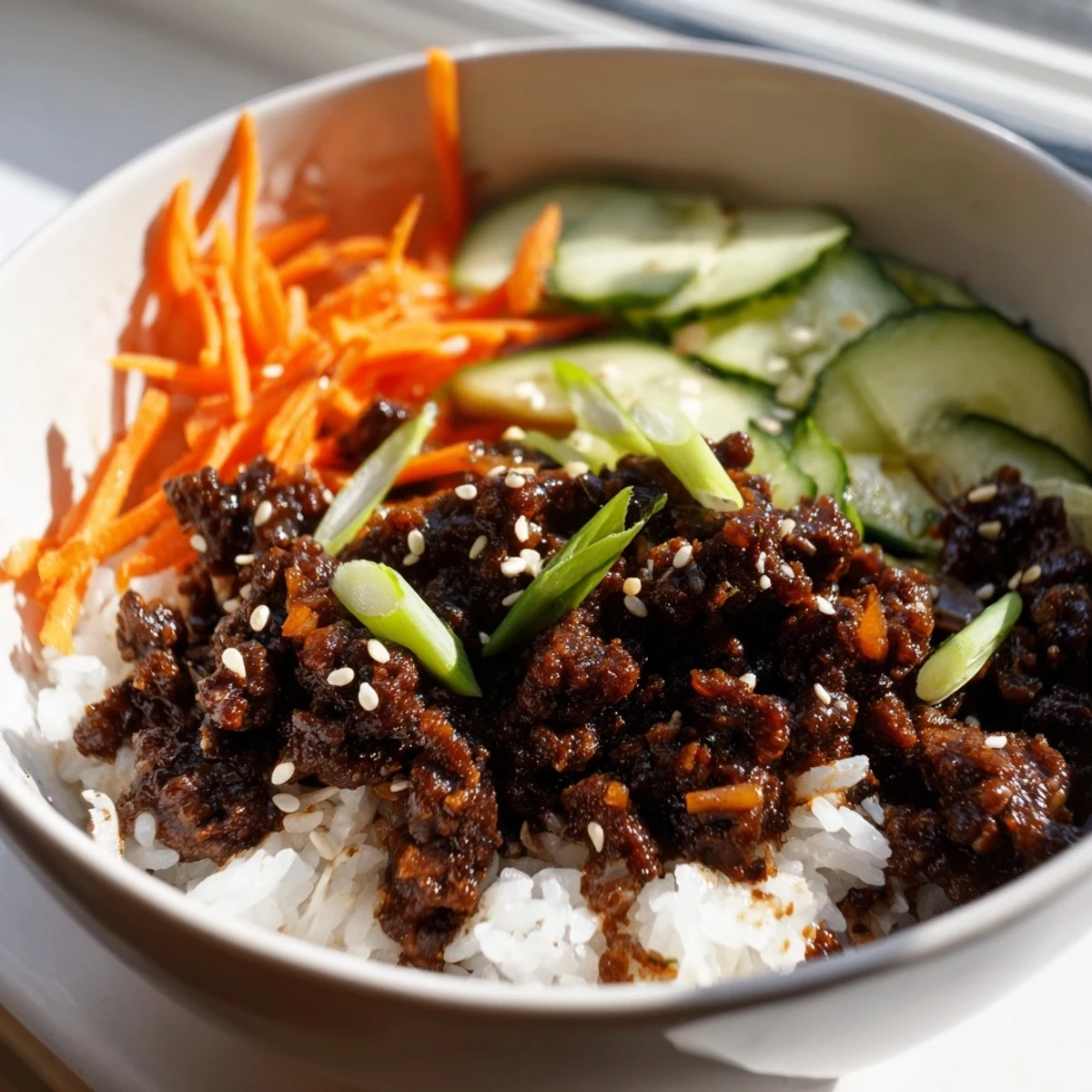- Divide the fluffy rice among four bowls and top each with a generous portion of the saucy beef. Arrange the carrots, cucumber, scallions, and sesame seeds on top like edible confetti.