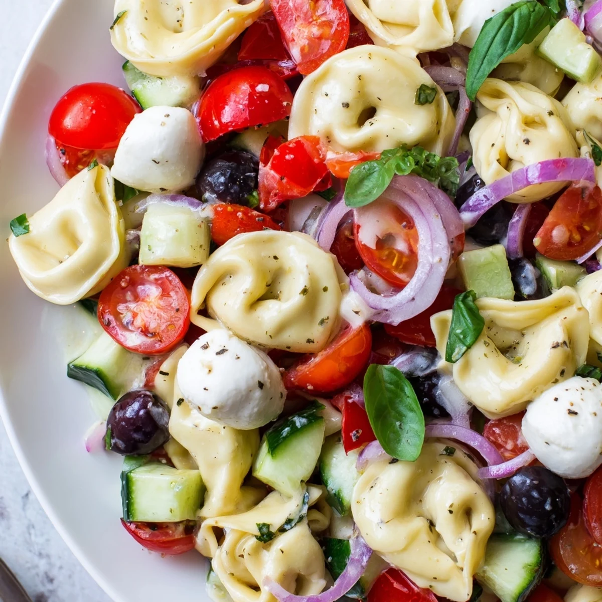 This colorful cold pasta salad brings together tender cheese-filled tortellini with a medley of crisp vegetables including cherry tomatoes, cucumber, red bell pepper, and red onion. Fresh mozzarella balls and grated Parmesan add rich, creamy elements while a homemade zesty Italian dressing ties everything together with bright, tangy flavors.