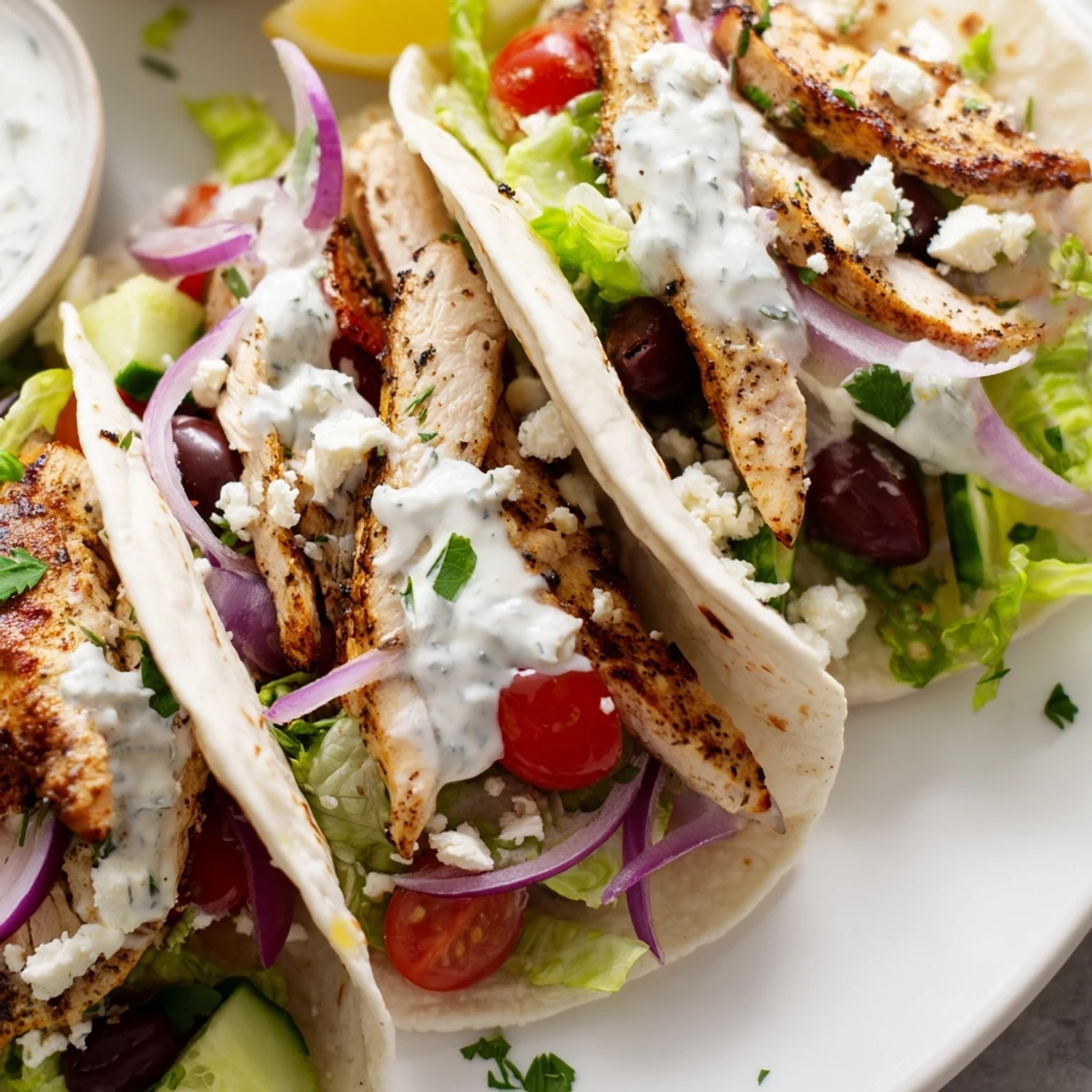 - Layer sliced chicken, lettuce, tomatoes, cucumber, red onion, olives, and feta onto each tortilla. Drizzle generously with the yogurt sauce and finish with fresh parsley.